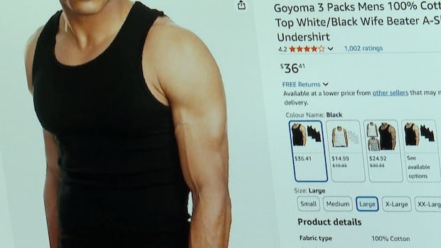 After being informed by CBC News about the advertising watchdog’s ruling, one Amazon dealer, WANGYUNHUI2025, removed the term “wife beater” from its men’s tank top ads. (Amazon)
